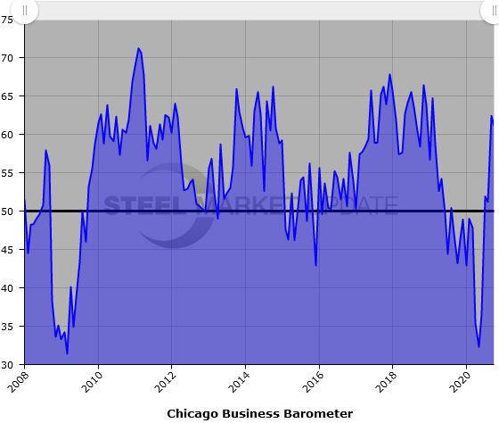 Below is a graph showing the history of the Chicago Business Barometer. You will need to view the graph on our website to use its interactive features; you can do so by clicking here. If you need assistance logging in to or navigating the website, please contact us at info@SteelMarketUpdate.com.