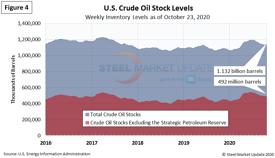 Total crude oil stocks in the U.S. had been on the rise since mid-March, but started to decline in July. The latest price has declined to 1.132 billion barrels as of Oct. 23, up from 1.066 billion barrels at the beginning of the year (Figure 4).