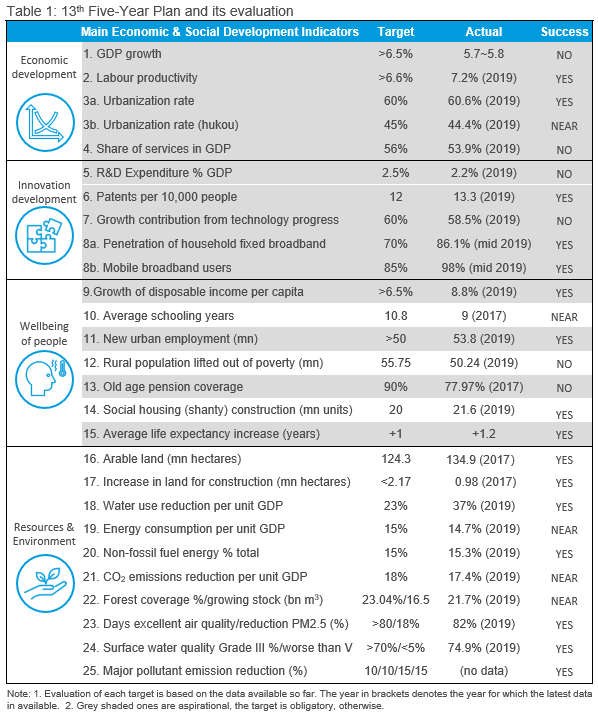 The Five-Year Plan can be divided into many subcomponents for all major sectors of the economy, industries and society. However, for convenience and simplification, the 13th Five-Year Plan can be summarized by 25 main economic and social development indicators covering four broad categories: economic development, innovation, wellbeing of people, and resources and environment. These indicators are shown in the accompanying table together with CRU’s assessment of their success or otherwise (see Table 1).