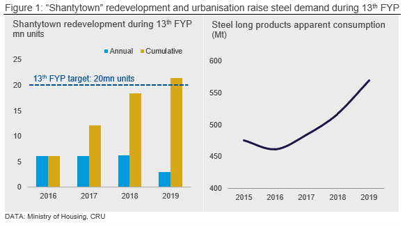 Second, the target for urbanization rate rose from 56% to 60%. Related to this the target for social housing or “shanty housing” reconstruction was set at 20 million units. Both appear to have been more than successfully accomplished by the end of 2019 (Figure 1). As a result, this success has generated significant growth in China’s metals demand in recent years. “Shantytown” redevelopment involves compensation, demolition and rehousing in newly built housing. We estimate that the replacement of 20 million units created direct demand for the equivalent of ~75 million tonnes of steel. Together with other drivers, this has helped Chinese finished steel demand to grow by almost 20% from 2015 to 2019. Much of this growth emanates from steel long products, which are used in construction. This shows just how important it is to follow new targets for urbanization and social housing in the next Five-Year Plan.