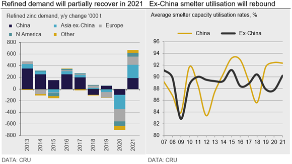Despite this year’s mine supply losses, many smelters have continued to produce normally, helped by being allowed to continue operating through lockdowns in some countries, concentrate stocks compensating for mine supply losses, and zinc prices which have risen by more than enough to offset falling TCs. The main exceptions to this are Vedanta’s Indian smelters, where the expected increase in mine supply did not materialize and smelter output therefore remained flat y/y, Vedanta International’s Skorpion, which ceased production in 20 Q1, and Nexa’s Cajamarquilla, which was impacted by the lockdown in Peru in H1.