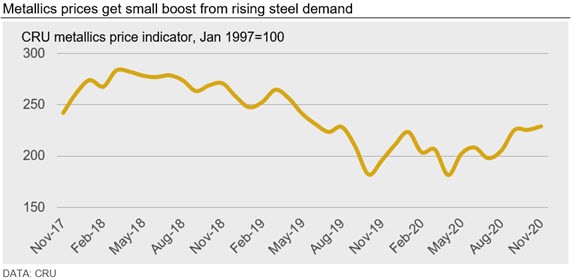 With finished steel prices still on the rise and scrap markets seasonally tighter in many areas, we expect that both ore-based metallics and scrap prices will rise in December. An exception to this may again be in Europe as countries there go back into lockdown, although if this limits scrap supply, prices may still find some support.