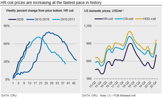 North American sheet prices have continued to surge after bottoming this past August. For HR coil, prices have been assessed at $712 /s.ton. Since Aug. 12, these prices have gained $237 /s.ton, or 63%. This is the fastest percent gain over three months in CRU’s 41 years of steel price assessments.