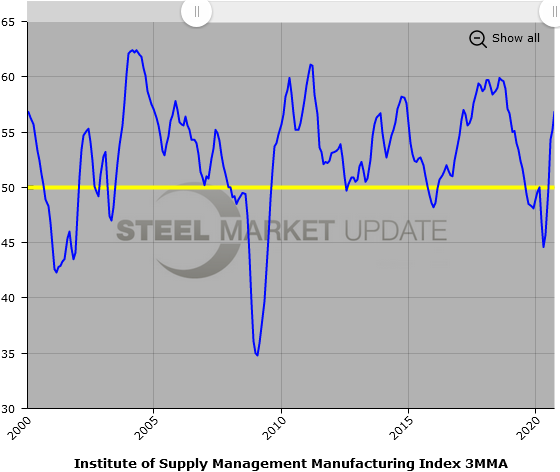 Below is a graph showing the history of the ISM Manufacturing Index on a three month moving average. You will need to view the graph on our website to use its interactive features; you can do so by clicking here. If you need assistance logging in to or navigating the website, please contact us at info@SteelMarketUpdate.com.