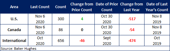 The number of active U.S. rigs increased by 4 to 300, with oil rigs up 5, gas rigs down 1, and miscellaneous rigs unchanged. Compared to this time last year, this week’s count is down 517 rigs, with oil rigs down 458, gas rigs down 59, and miscellaneous rigs unchanged. See the first graph below for a history of active U.S. rig counts.