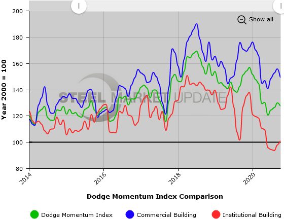 “The Momentum Index has struggled to make consistent gains since passing its post-pandemic low in June. Economic growth has slowed over the past few months, creating weaker demand for commercial projects,” said Dodge Data & Analytics. “The fear about a new wave of COVID-19 infections may also be impeding planning activity in consumer-focused projects such as hotels and retail, although planning for warehouse projects continues to impress. Even with this month’s gain, the institutional component of the Momentum Index remains well below levels seen prior to the pandemic as state and local entities come to grips with the widening budget chasm.”