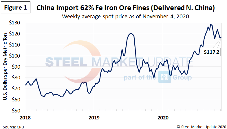 The Chinese import price of 62% Fe content iron ore fines soared to a multi-year high in August, slightly declining since then but remaining strong. Figure 1 shows the price of 62% Fe delivered North China since January 2018, currently at $117.2, up 39.0 percent over levels one year ago.