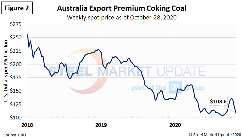 The price of premium low volatile coking coal FOB east coast of Australia jumped from mid-September through mid-October, but has since declined near the mid-2020 low, currently at $108.6 dollars per dry metric ton as of Oct. 28 (Figure 2). The seaborne coking coal price has not been able to fully benefit from the strong demand in China due to import restrictions. Recent coking coal prices remain at their lowest levels seen in SMU’s limited history.