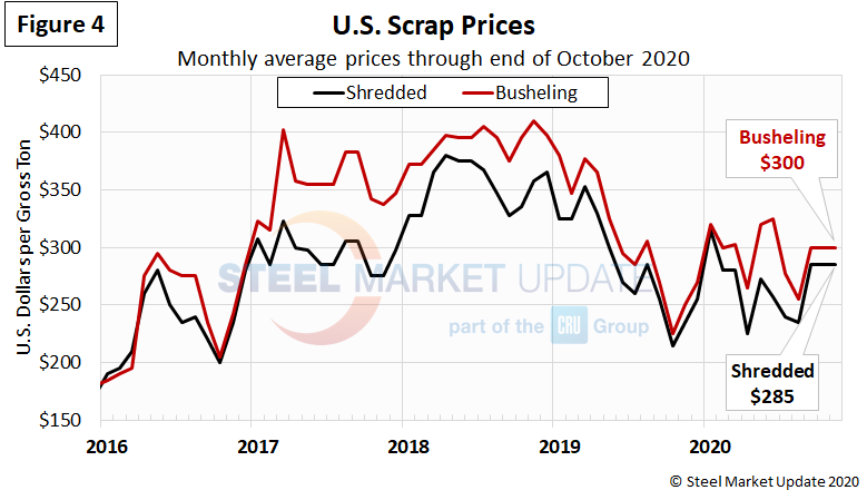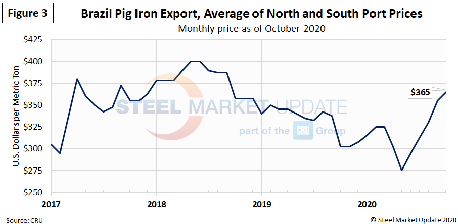 Most of the pig iron imported to the U.S. currently comes from Russia, Ukraine and Brazil. This report summarizes prices out of Brazil and averages the FOB value from the north and south ports. The latest data through October shows an average pig iron price of $365 per metric ton, up 33 percent from the May 2020 low of $275. Pig iron prices had declined erratically since mid-2018, but have risen each month since June 2020 (Figure 3).