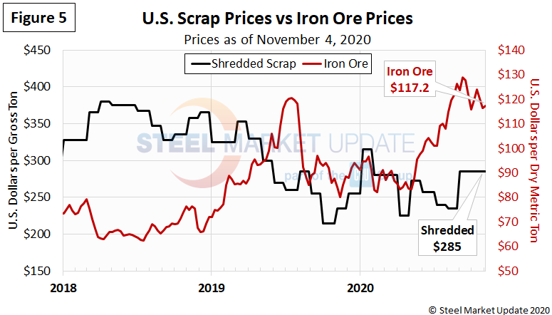 Figure 5 shows the recent spread between the price of iron ore, at $117.2 per dry metric ton, and shredded scrap at $285 per gross ton. Ore has moved higher since May, lending some support to finished steel prices.