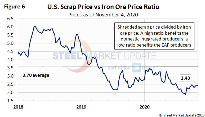 To compare the two, Steel Market Update divides the shredded scrap price by the iron ore price to calculate a ratio (Figure 6). A high ratio favors the integrated/BF producers, a lower ratio favors the minimill/EAF producers. As the 2.43 ratio shows, the increases in the price of ore, in contrast to smaller changes in the price of scrap, have added to the minimills’ competitive cost advantage. This ratio hit an all-time low of 1.86 in late-August 2020 (in our 12+ year limited data history).