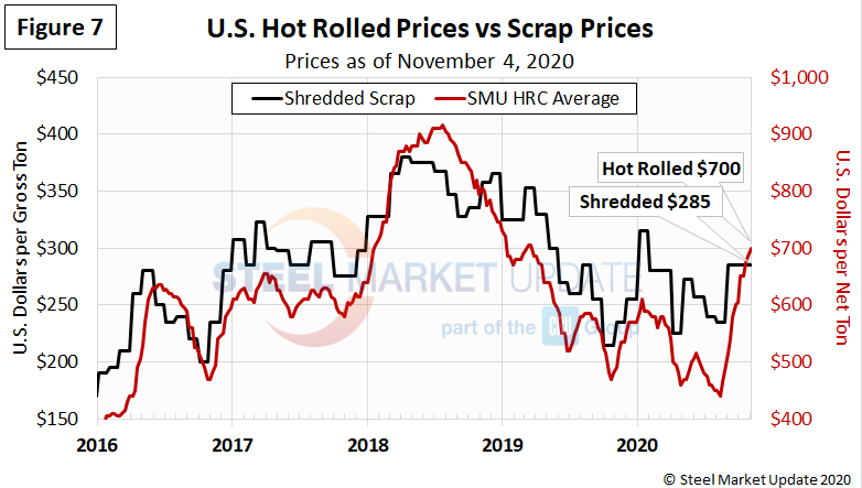 Figure 7 shows how the price of hot rolled steel generally tracks with the price of shredded scrap. Shred rose by approximately $50 from August to September, remaining unchanged in October, while hot rolled prices have risen $260 per ton over since August.