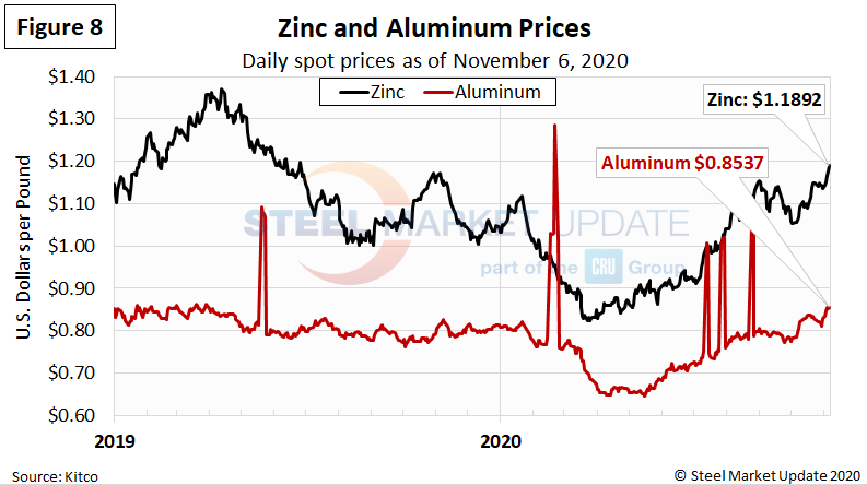 Zinc, used to make galvanized and other products, has steadily risen since March, reaching a 16-month high at the end of last week (Figure 8). The LME cash price per pound of zinc as of Nov. 6 was $1.1892, up 38 percent from the mid-March low of $0.8236. The price of zinc factors into the coating extras charged by the mills for galvanized products. Many mills had revised their coating extras upwards in August and September to reflect the higher zinc price. Aluminum prices, which factor into the price of Galvalume, have also been trending upwards over the last few months. Note that aluminum prices often have large swings and return to typical levels within a few days, as seen in the graphic below. The LME cash price per pound of aluminum was $0.8537 as of Nov. 6.