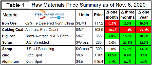 Among steelmaking raw materials, the prices of pig iron, scrap, zinc and aluminum have seen big gains in the past three months. Pig iron and scrap prices have seen significant increases compared to the late summer months. Iron ore and coking coal prices had widened through mid-September but have since declined, with coking coal prices nearing a multi-year low.
