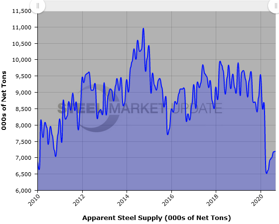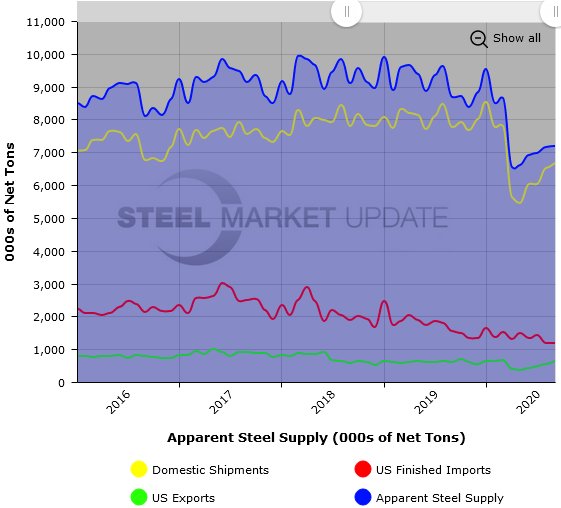 To see an interactive graphic of our Apparent Steel Supply history (example shown below), visit the Apparent Steel Supply page in the Analysis section of the SMU website. If you need any assistance logging into or navigating the website, contact us at info@SteelMarketUpdate.com or 800-432-3475.