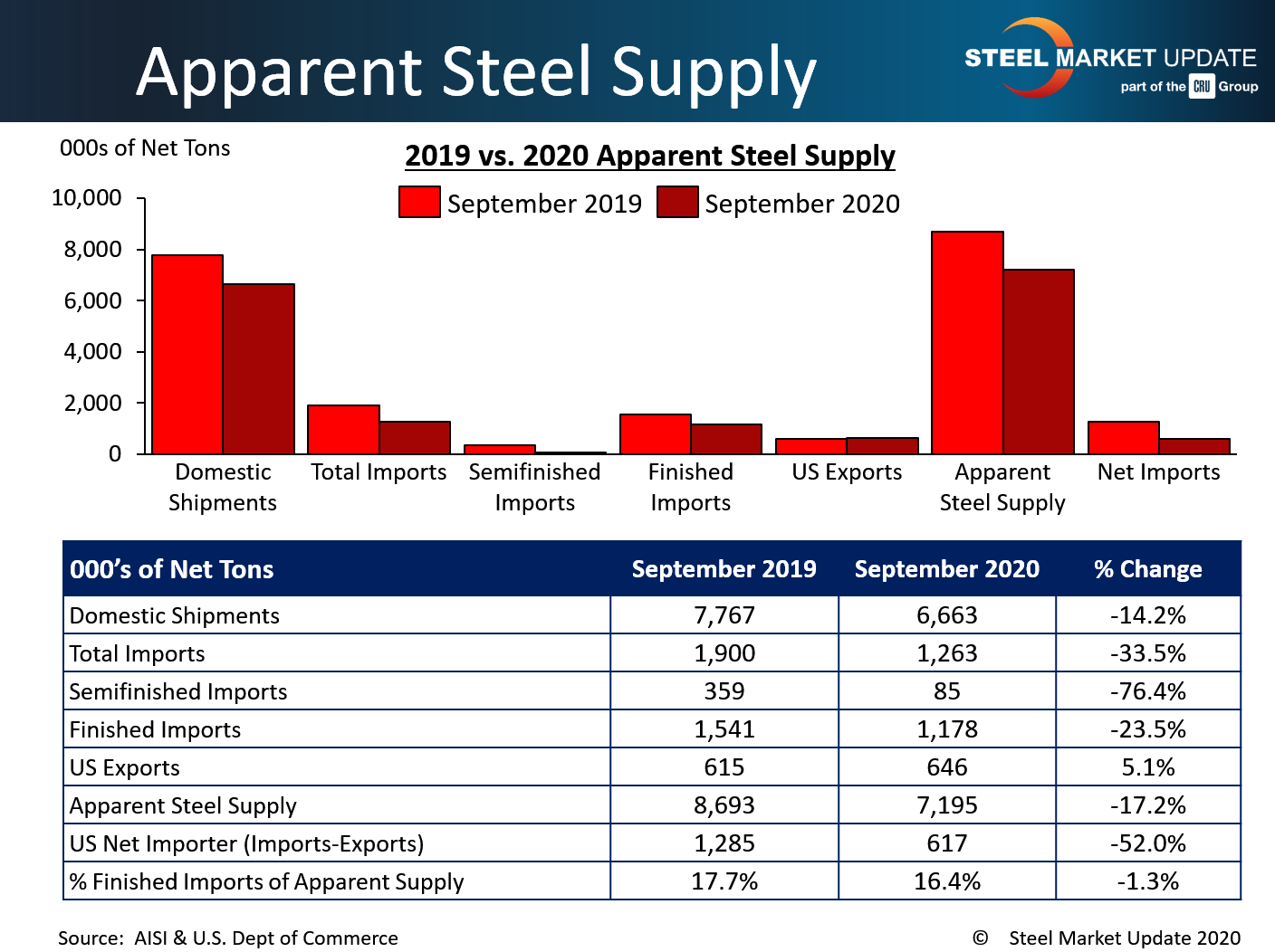 Compared to the prior month when apparent steel supply was 7.17 million tons, September supply rose 26,000 tons or 0.4 percent. This change was due to a 130,000 ton increase in domestic shipments, mostly negated by a 95,000 ton increase in total exports and a 10,000 ton decline in finished imports.
