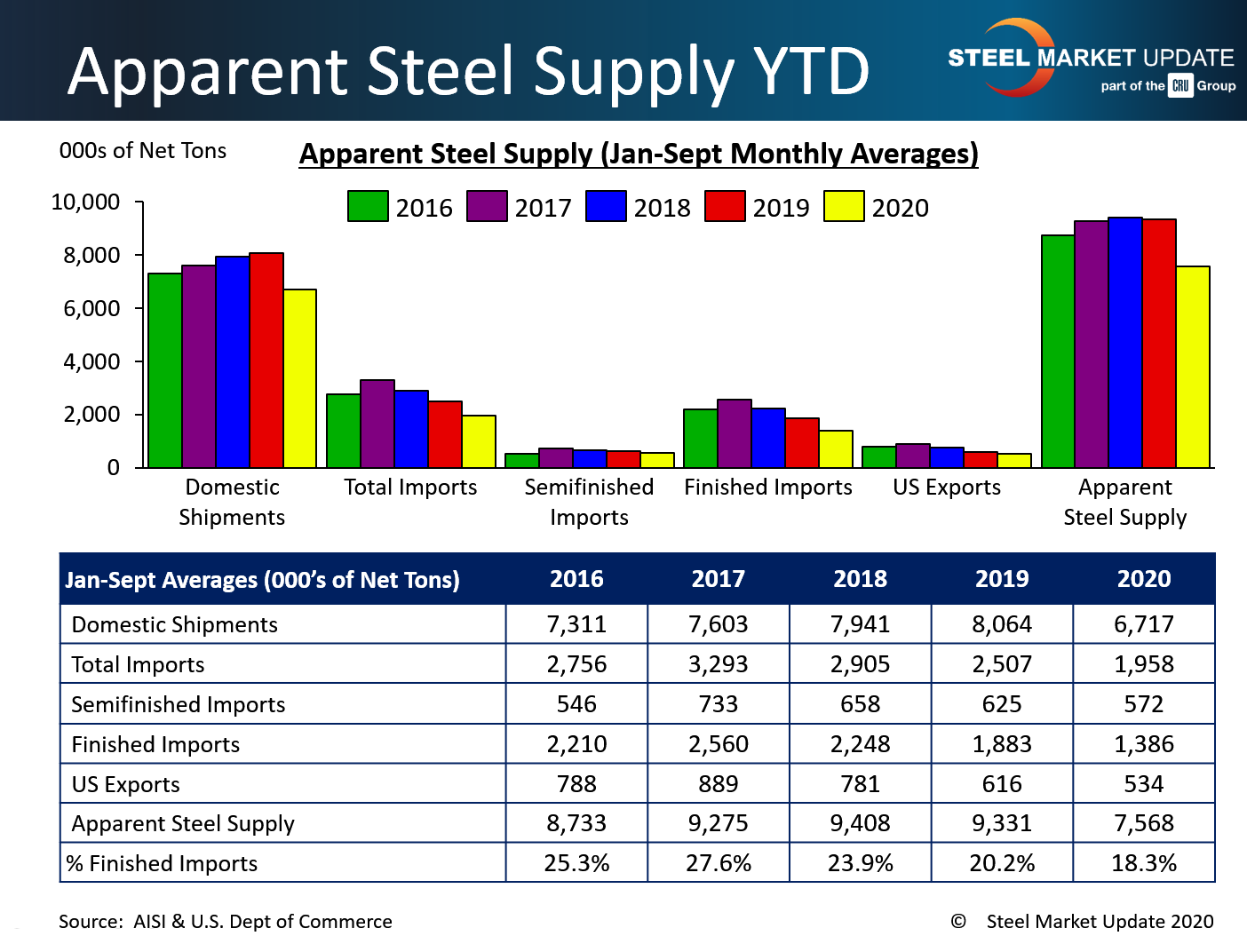 U.S. apparent steel supply remained flat from August to September, up 0.4 percent to 7.19 million net tons, according to the latest U.S. Department of Commerce and American Iron and Steel Institute data. While supply levels have improved each month since May, recall that April and May were the two lowest levels seen in the last 10 years at 6.54 million tons and 6.61 million tons, respectively. Apparent steel supply, a proxy for demand, is determined by combining domestic steel mill shipments and finished U.S. steel imports, then deducting total U.S. steel exports.