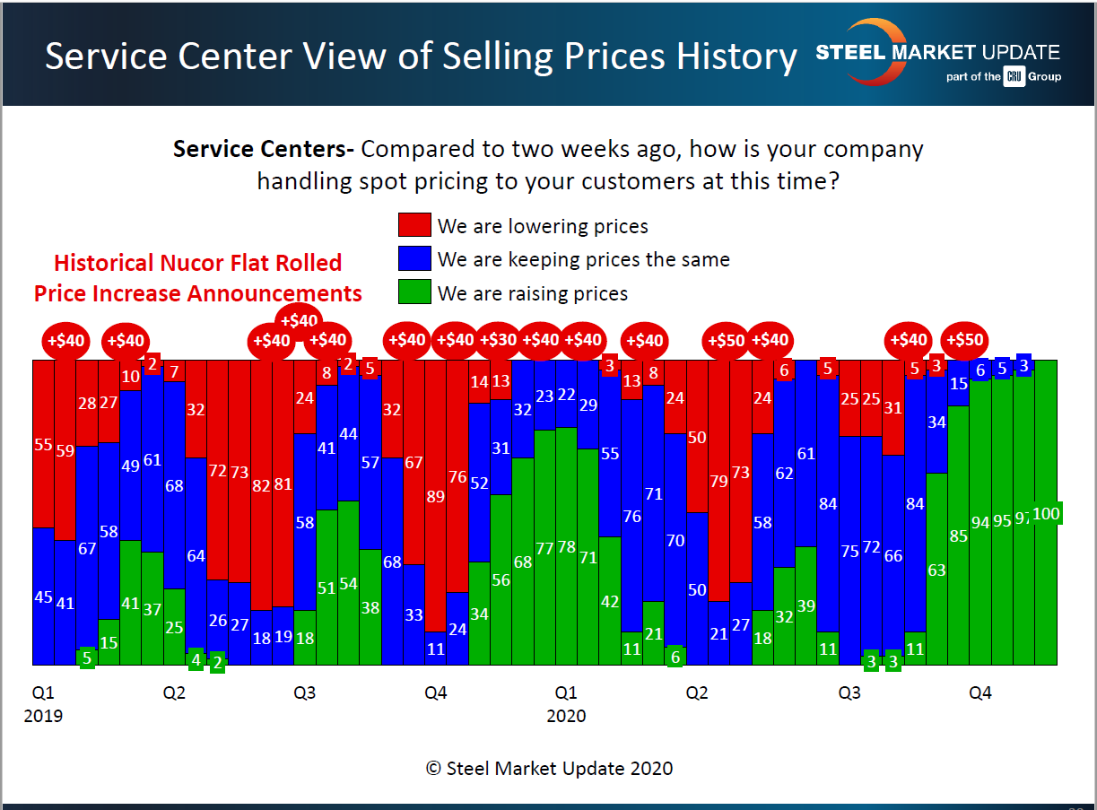Steel Market Update’s check of the market this week shows that the flat rolled mills are extremely busy and operating near full capacity. More than 80 percent of the service center and OEM executives responding to SMU’s questionnaire said they are seeing late deliveries from their mill suppliers. More than 60 percent expect a shortage of at least some products in the next few months. Various factors point to even higher steel prices.