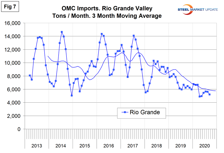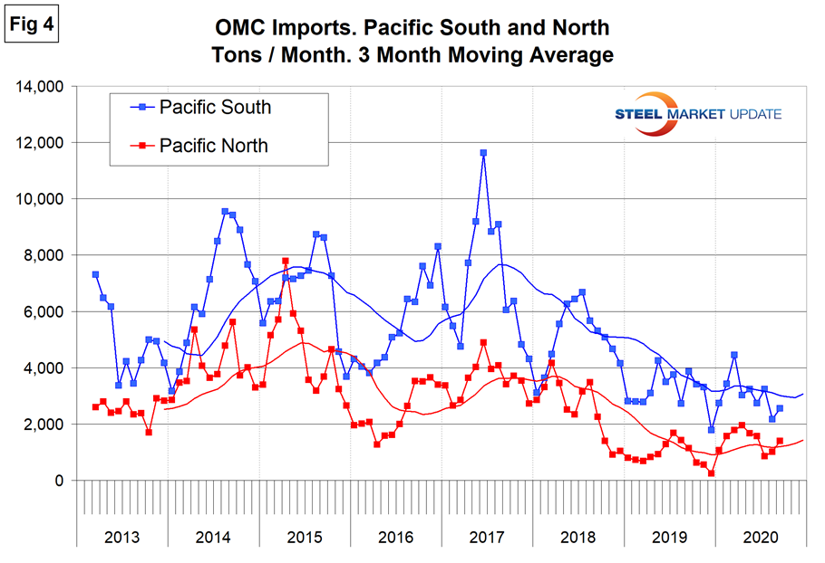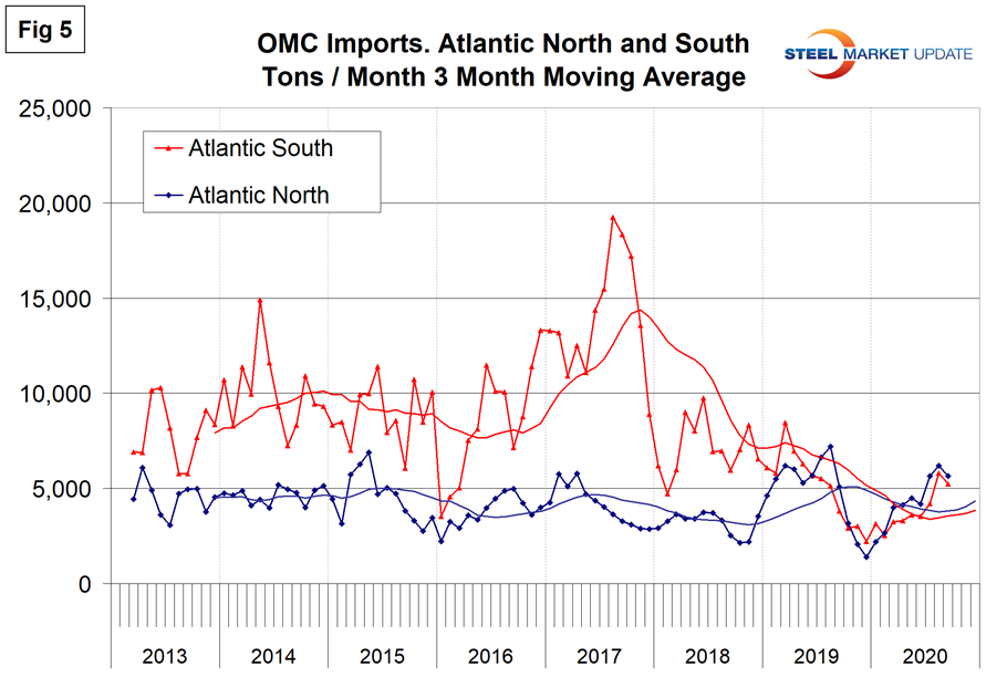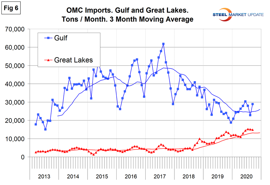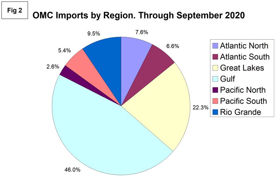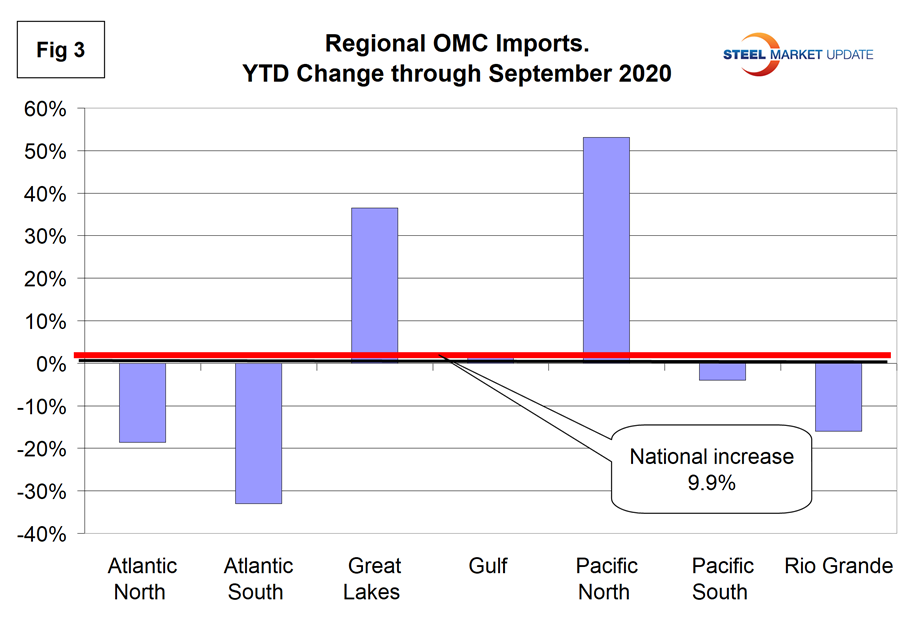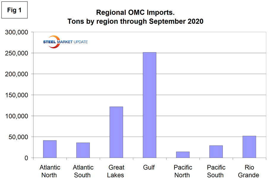 In September, OMC imports were up by 0.9 percent at the national level. This was the only flat rolled product to experience a year-over-year increase. On a regional basis, this ranged from a 53 percent increase in the North Pacific to a 33 percent decline in the South Atlantic. The Gulf has received by far the most tonnage in 2020 and accounts for 46 percent of the national total. Tonnage into the Atlantic N. and S. and Pacific N. and S. each accounted for less than 8 percent of the total.