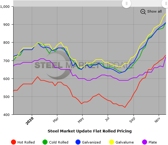 SMU Note: Below is a graphic showing our hot rolled, cold rolled, galvanized, Galvalume and plate price history. This data is available here on our website with our interactive pricing tool. If you need help navigating the website or need to know your login information, contact us at info@SteelMarketUpdate.com.