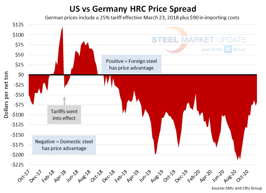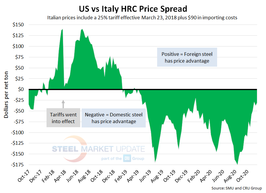 CRU published Italian HRC prices at $537 per net ton, up $11 from last week and up $26 over two weeks ago. After adding tariffs and import costs, the delivered price of Italian HRC is approximately $761 per ton. Accordingly, domestic HRC is theoretically $31 per ton cheaper than imported Italian HRC. U.S. prices have held this price advantage for over a year and a half. Recall the record high in mid-August when domestic HRC held a $176 per ton price advantage over Italian imports.