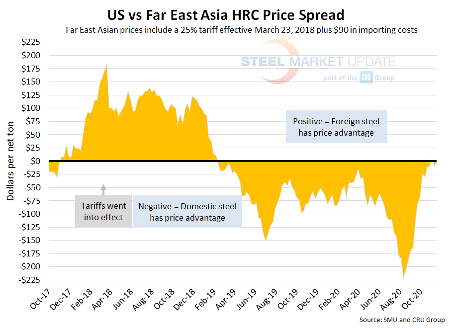 Steel Market Update’s latest foreign vs. domestic hot rolled steel price comparison shows that steel imports have become more enticing to U.S. buyers than in previous months, according to the latest SMU and CRU price indices. In our previous update in early November, U.S. producers had lost their price advantage over HRC imports from Far East Asia. Foreign and domestic prices have risen at a relatively similar rate since then, meaning the price spreads are within $4 of what was previously published. Recall that the price differentials between domestic HRC compared to foreign imports had widened through mid-August to reach record highs, but have since declined sharply as steel prices in the U.S. have risen.