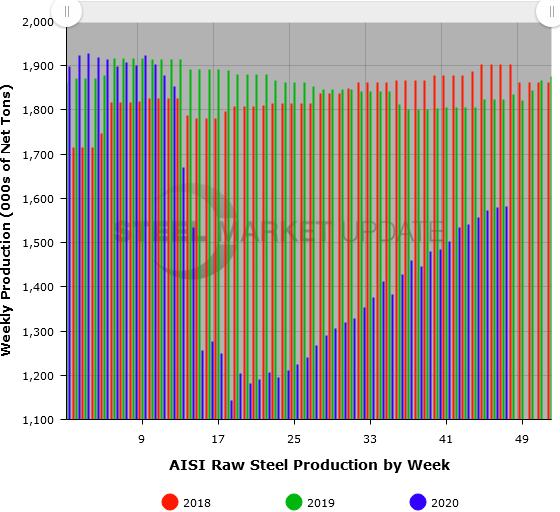 Weekly raw steel production by U.S. mills totaled 1,582,000 net tons in the week ending Nov. 21. The operating rate was a fraction higher than the prior week at 71.5 percent. Despite the steady increase in production through much of 2020, the latest week’s output remains 13.2 percent behind the same week last year when the operating rate was 78.8 percent, reported the American Iron and Steel Institute.