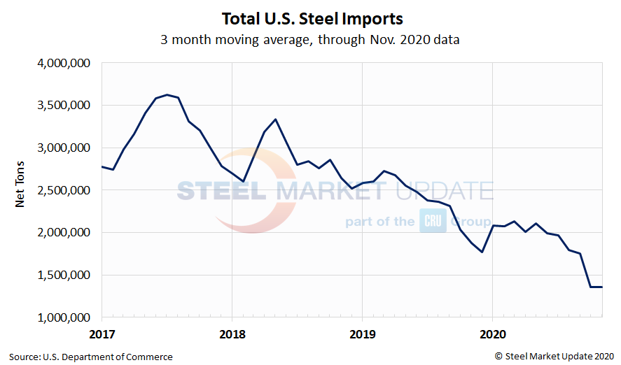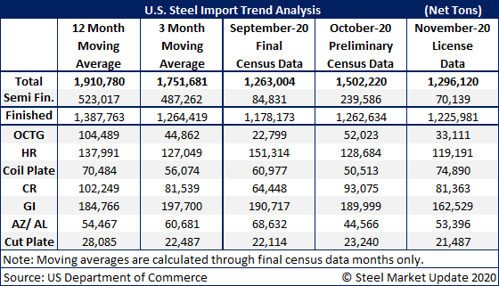 Due to large month-to-month swings in semifinished imports, the chart below shows total monthly imports on a three month moving average (3MMA) basis in an attempt to more accurately display the U.S. steel import trend. The 3MMA for November is now 1.35 million tons, almost idential to October. The average monthly import level for 2020 is now 1.86 million tons.