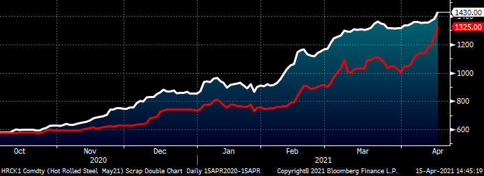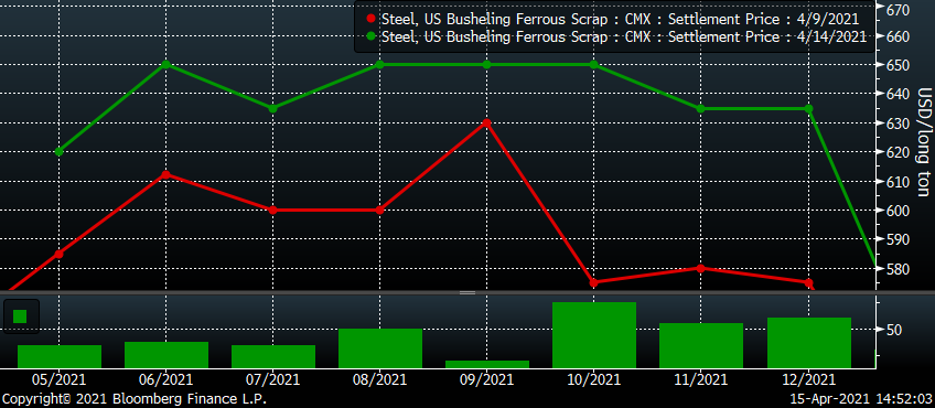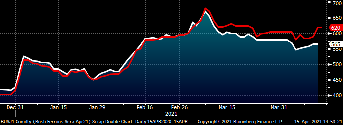 April (white) and May (red) CME Midwest Busheling Scrap Futures $/GT