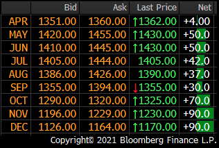With the low hanging fruit quickly picked, buyers set their attention on the fourth quarter, which is up $180 so far this week (see above). This next chart shows the evolution of the May and October future. As you can see, the May future separates itself from the October future starting in February through the end of March. Then, down the stretch they come with October’s future galloping like Silky Sullivan into today’s close.
