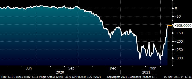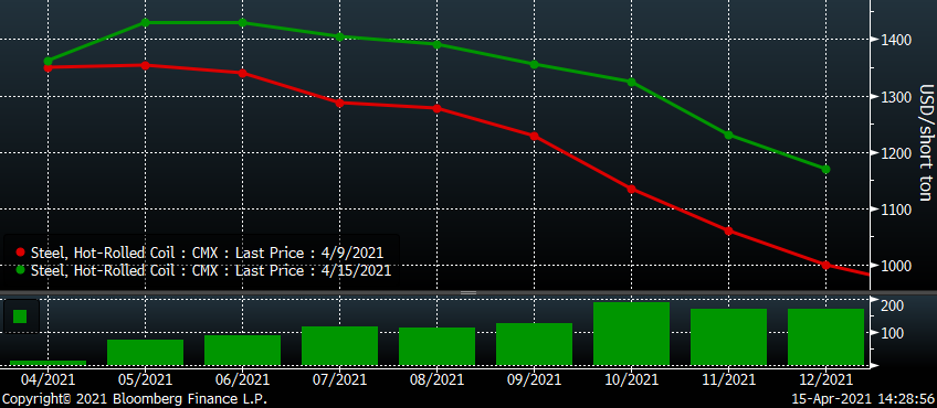 This chart shows the spread (y-axis) between the May and October futures by subtracting the May from the October future. Up until last September, these two contracts were so far in the future and lightly, if not barely, traded, they were priced within $5 to $10 bucks of one another. Once the rally started in September and some market participants began trading Q2 and May, the spread started to open up. By the end of 2020, May was trading $857 and October $732 for a spread of $150. As hot rolled prices exploded higher, the spread expanded to where October was $300 below May. Since April started, Silky Sullivan HRCV1, the October future, has recaptured two-thirds of that and is now only $105 below May.