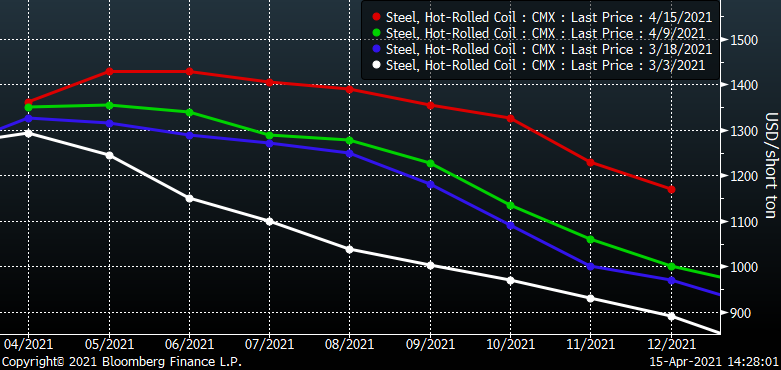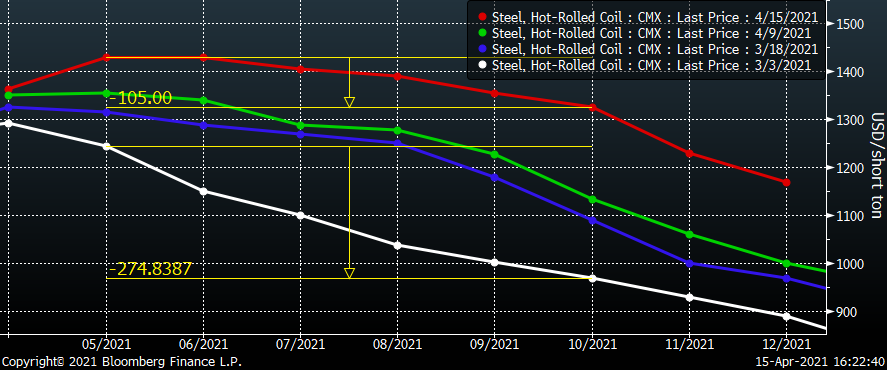 The last time I wrote an article for SMU (3/18), I pointed out that the HR curve had been flattening likely due to those with expectations or concerns that the current tight market conditions will continue buying forward to lock in value anywhere they could. The chart below shows the CME HRC curve on four dates starting on March 3. On March 3, the August future was $1,038 and the September future was $1,003. April was $1,300, so August was $262 below April, while September was about $300 below April. Through March and into April, buyers have been scooping up those August and September futures, which are now above April at $1,390 and $1,355, respectively. In fact, August is above all of the physical indices and September is above half of them.