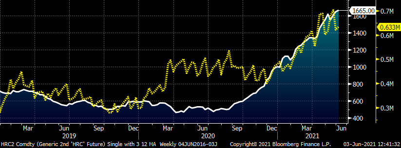Both the futures and open interest have been moving sharply higher since the start of 2021. Increasing open interest accompanying a rally is considered to be a technical indicator of a strong bull market. The basis for why this is a bullish technical indicator is that open interest increasing along with higher prices tells us buyers are opening new positions and are willing to pay higher prices to do so. If the higher prices were primarily due to short sellers getting squeezed and covering losses, open interest would decline. Open interest reached a new all-time high just above 700k tons last month and is currently at 633k tons. Years ago, concerns over the hot rolled market’s liquidity kept many would-be participants on the sidelines. It appears between the increased liquidity and whiplash volatility that started in 2018, more folks are entering the market than ever before.