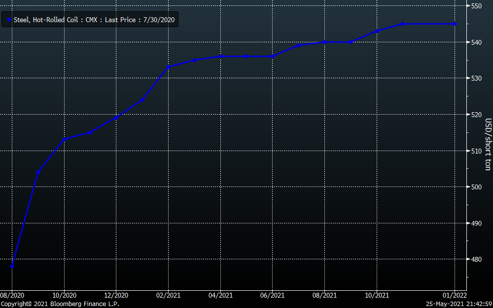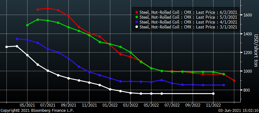 This graph shows the Midwest HRC futures curve settlement as of the first day of the months of March through May and then last night’s settlement in red. HR futures are backwardated or downward sloping. Generally speaking, one reason a futures curve is in backwardation is because of a shortage of the underlying physical product. To review, the hot rolled futures curve is telling us the physical hot rolled market is in a strong bull market and appears to be due to a shortage. So, there you go…how helpful has this article been so far!