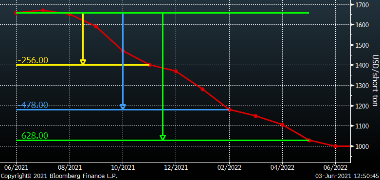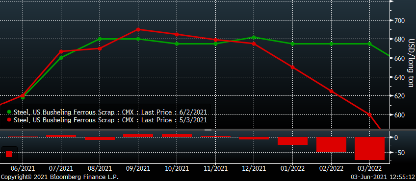 The busheling curve increases to $680 in August and then remains at those elevated prices through year-end. After that, the curve falls back toward $600. It will be interesting to see how the supply and demand play out considering the new EAF mills sparking in the coming months. Notice, busheling future’s curve is upward sloping or in contango indicating normal supply. However, the metal spread above $1,000 in June and July might provide some room for scrap to appreciate. Could you imagine $800 busheling? Keep an open mind in ’21.