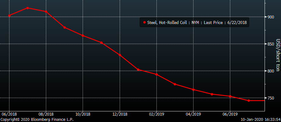 This charts shows the rolling 2nd month CME Midwest HRC future (white) and the total aggregated open interest in short tons (yellow) for all CME Midwest HRC futures contract months. If open interest is unfamiliar to you, it provides how many outstanding futures contracts there are at the end of each day. If a contract has zero open interest and there is a trade for 200 tons between buyer A and seller B, then there will now be 200 tons of open interest posted at the end of the day. If the next day, seller B buys back 200 tons from seller G, there is still 200 tons of open interest. If the following Monday, buyer A sells 100 tons back to seller G, then both will have realized a gain or a loss on the 100 tons traded and open interest decreases to 100 tons.