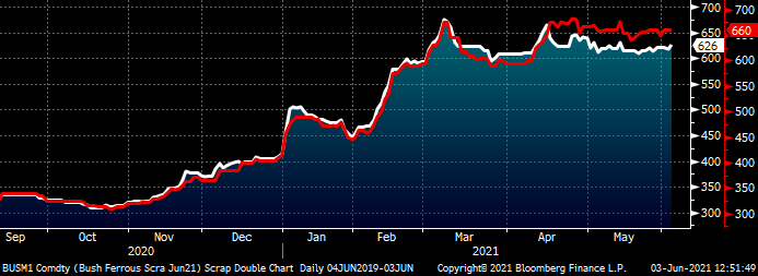 Despite the relentless rally in hot rolled, busheling futures have been mostly flat since April. The May future actually settled down slightly at $564.07. With a week to go, June busheling scrap is rumored to be up $50 at $615. The July CME busheling future trading today at $660 indicates further price appreciation in scrap.