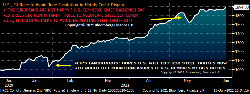 So far in 2021, there have been two corrections in CME hot rolled futures and both were related to comments regarding ending the Section 232 tariffs on steel and aluminum.