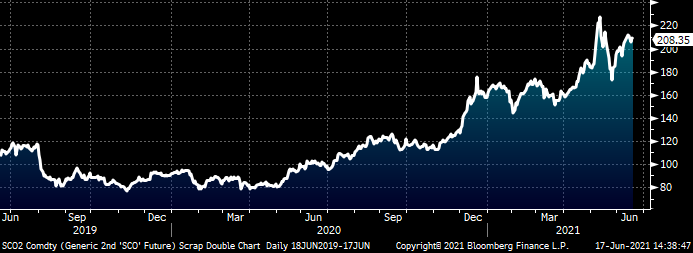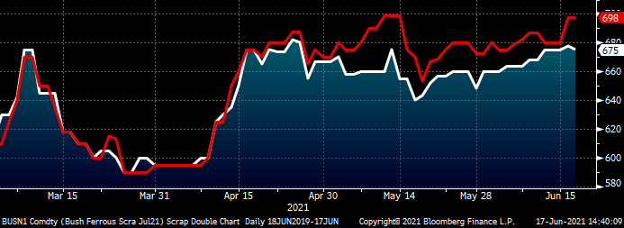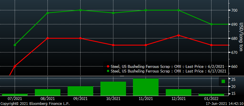 The June CME busheling future contract’s final settlement of $629 was up $65 MoM. The July future is already pricing in a further increase of $45 trading at $675, while the August future at $695 is pricing in another $20 increase. If August in fact settles at $695, it would be a $130 increase over the past three months.