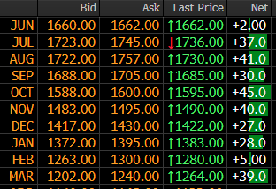 This graph shows the curve as of today and compares July, not June, to the December, March and June futures. Also 5, 8 and 11 months out. While October and November have gained relatively more than the front months, each of these spreads have expanded (because July is $100 above June) offering an even greater discount than they did two weeks ago. The curve has yet to flatten because the front end keeps marching higher!