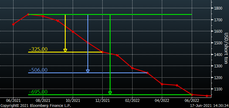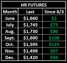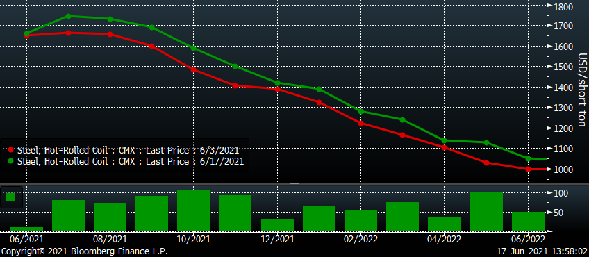 This first graph of the HRC curve was from my June 3 article and compares the June future to the November, February and May futures. That is 5, 8 and 11 months out.