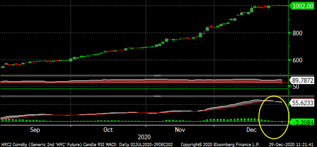 As has the MACD momentum indicator in the rolling 2nd month CME HRC future.