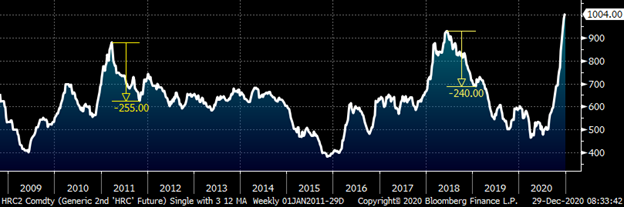 Set aside your personal situation for a minute and stand in awe of this rally. Looking back to the beginning of the CME Midwest HRC futures contract in 2008, there have been two other times the CME HRC future has seen a price spike like the one we are seeing now. In both cases, prices fell around $250 from peak to trough in the seven months after topping.