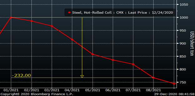Below is the CME Midwest HRC futures curve with January at $1,000 and August, seven months after, at $768 or $232 below January. Interesting how that fits together.
