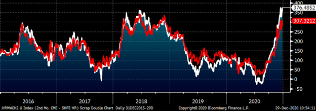 Rolling 2nd (wh) & 5th (red) Month CME Midwest HR – SHFE Chinese HR USD/st