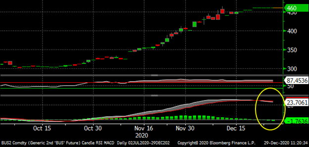 As all of this is happening globally, the MACD momentum indicator in the rolling 2nd month CME busheling future has turned negative.