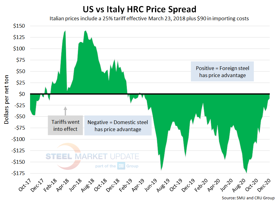 The following calculation is used by Steel Market Update to identify the theoretical spread between foreign hot rolled steel prices (delivered to U.S. ports) and domestic hot rolled coil prices (FOB domestic mills). This is only a “theoretical” calculation as freight costs, trader margin and other costs can fluctuate, ultimately influencing the true market spread. This compares the SMU U.S. hot rolled weekly index to CRU hot rolled weekly indices for Germany, Italy and Far East Asian ports.