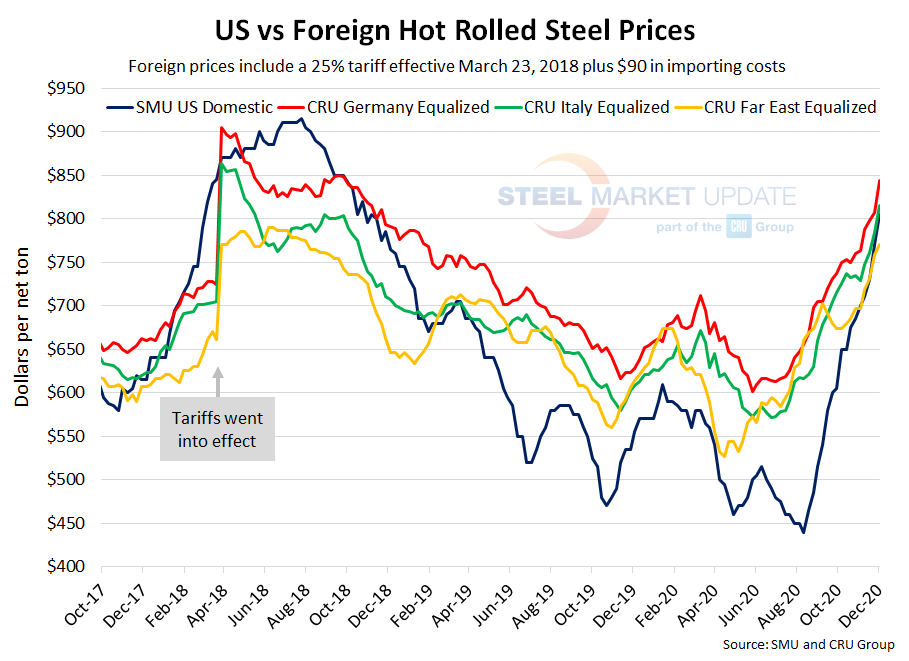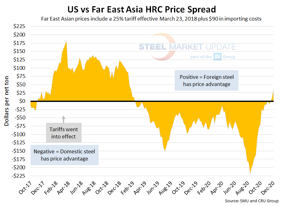 As of Wednesday, Dec. 2, the CRU Far East Asian HRC price rose $9 per ton over last week at $544 per net ton, $31 higher than the price two weeks ago. Adding tariffs and import costs, the delivered price of Far East Asian HRC to the U.S. is $770 per ton. The latest SMU hot rolled price average is $805 per ton, up $35 over last week and up $75 from two weeks prior. Therefore, U.S.-produced HRC theoretically is now $35 per ton more expensive than imported Far East Asian HRC; foreign prices had held a brief advantage one month ago ($4), but were previously more expensive than domestic prices for over a year and a half. In mid-August, domestic HRC held a record high $220 per ton price advantage over Far East Asian HRC.