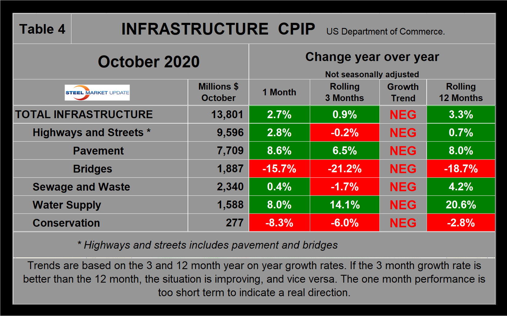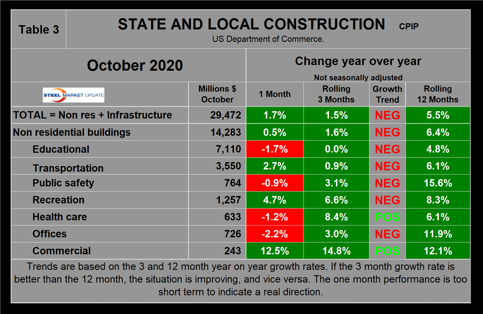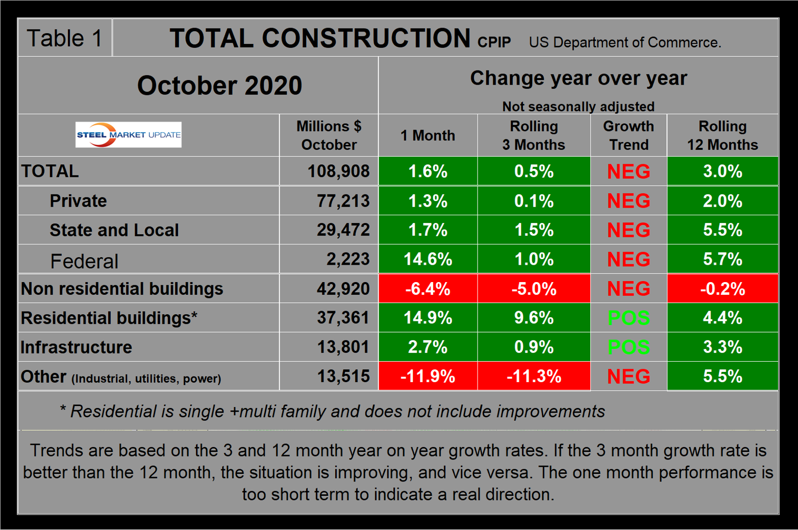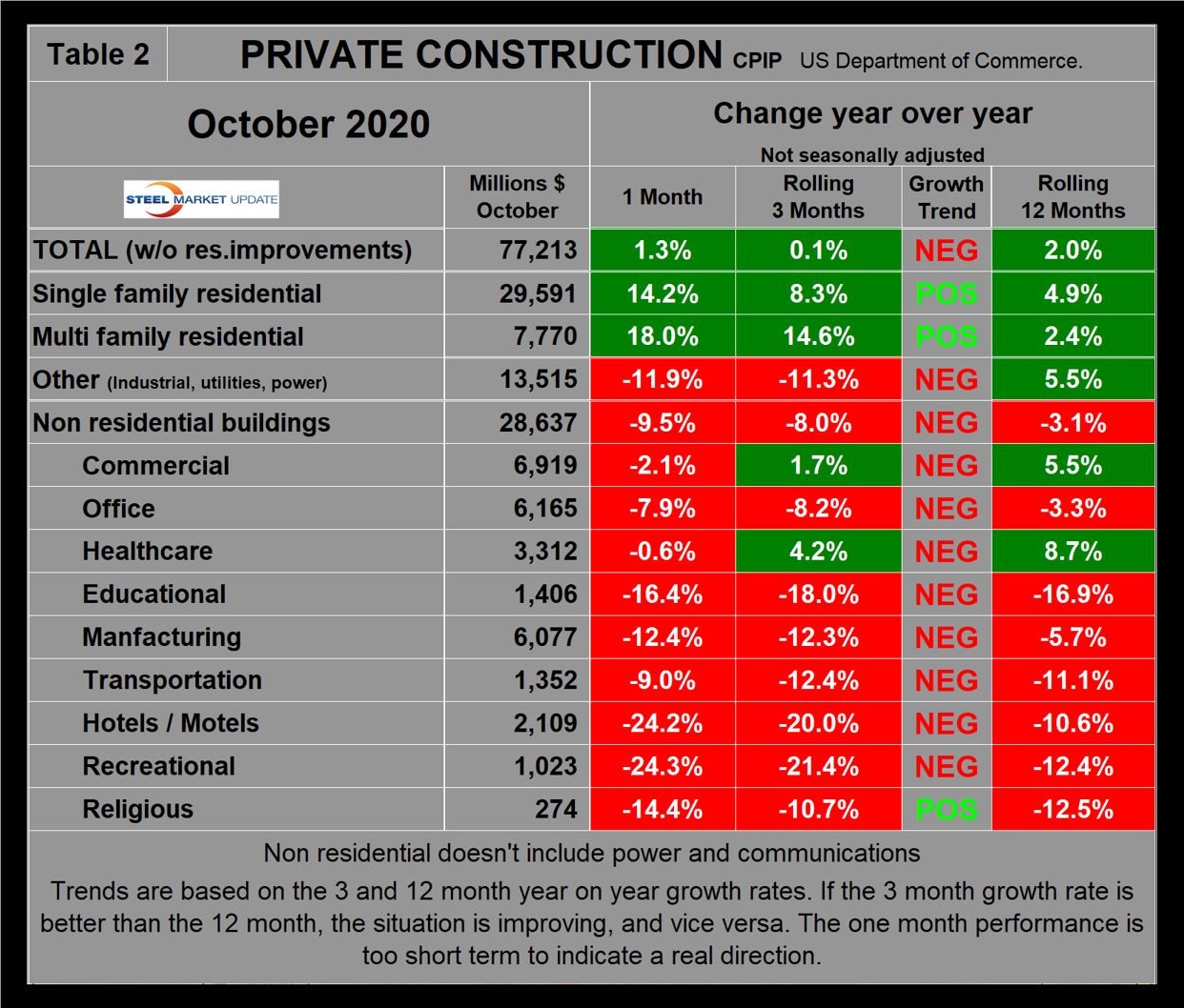 The official CPIP press release gives no appreciation of trends on a historical basis and merely compares the current month with the previous one on a seasonally adjusted basis. The background data is provided as both seasonally adjusted and non-adjusted. The detail is hidden in the published tables, which SMU tracks and dissects to provide a long-term perspective. This is a very broad and complex subject, therefore, to make this monthly write-up more comprehensible, we keep the information format as consistent as possible. In our opinion, the magnitude of growth or contraction of the various sectors is more important than the absolute dollar value of the expenditures. CPIP data also includes the category of residential improvements, which we have removed from our analysis because such expenditures are minor consumers of steel.