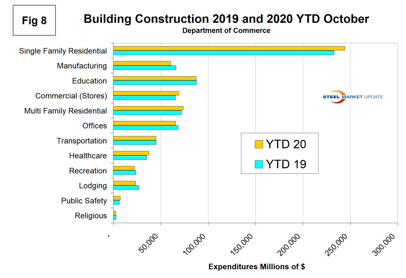 Figure 8 compares year-to-date expenditures for the construction of the various building sectors for 2019 and 2020. Single-family residential is dominant and in the first half of 2020 expenditures totaled $268.2 billion annualized.